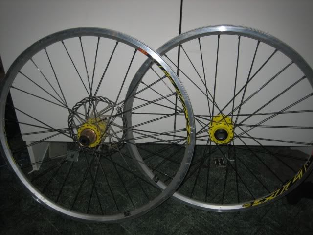 Mavic 721 på Nukeproof Generator nav. Episk med bulker i felgene, liten sprekk i forhjulet. Har syklet med dem i nevnte tilstand i den lokale DH løypa, holder seg bra tross påkjenningene. Har brukt settet en helg i Hafjell og Åre, så navene vil jeg si er i god tilstand.