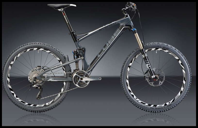 1 Cube Stereo RX i sort anodisert farge med hvit Fox F140RL gaffel. Demobrukt