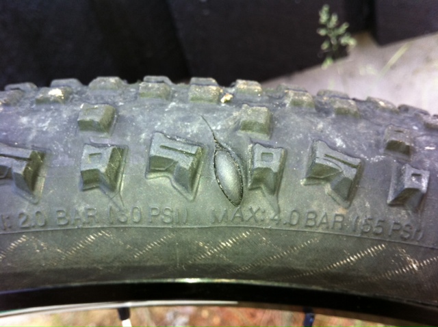 Punkterte med std Racing Ralph satt opp med guffe, det smalt skikkelig. Fomla litt, satte inn en tynn slange og fullførte deretter. Når jeg dagen etter renser sykkelen skikkelig ser jeg denne: Ganske utrolig at jeg kjørt 2/3 av rittet med denne, spør du meg.