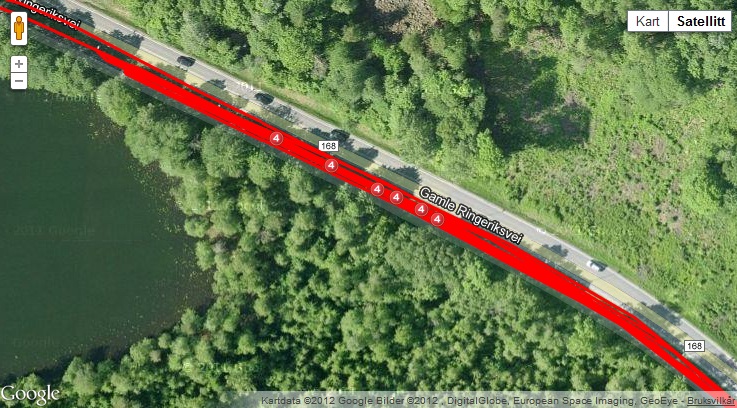 Se på dette bildet for et relevant eksempel. Her har jeg syklet det samme segmentet, Steinshøgda, seks ganger etter hverandre, ved å snu på toppen og trille ned igjen. Jeg snur altså der vannet er som nærmest gangveien, for å være sikker på ikke å snu for tidlig. Men legg merke til at målpunktet for segmentet ligger seks forskjellige steder, selv om det er det samme segmentet. Dette sikkert grunnet at min GPS har valgt å legge inn punkter akkurat der, slik at hver røde prikk med et firetall er det første registrerte punktet etter at jeg passerte mållinjen.