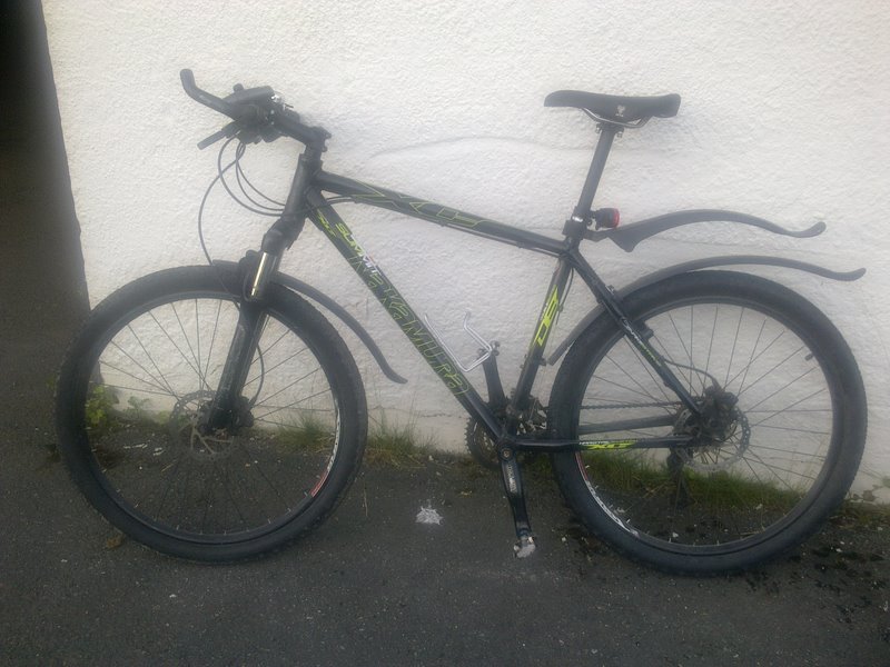 Noen fant det for godt å hente ut jobbsykkelen min fra garasjen natt til i dag. Kronemessig så har den naturligvis ikke store verdien, men annoying as he"# siden den ikke var funksjonell før i går kveld når jeg gav den 2 timer med TLC. Sykkelen er lett å kjenne igjen, all den tid den har min egen "double rear mud protection" :-)