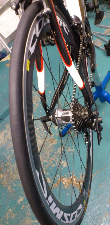 Den har full Dura-Ace 7900-gruppe og Mavic Cosmic Carbone SL-hjul med Powertap SL+ (ANT+ og Garmin-kompatibel).