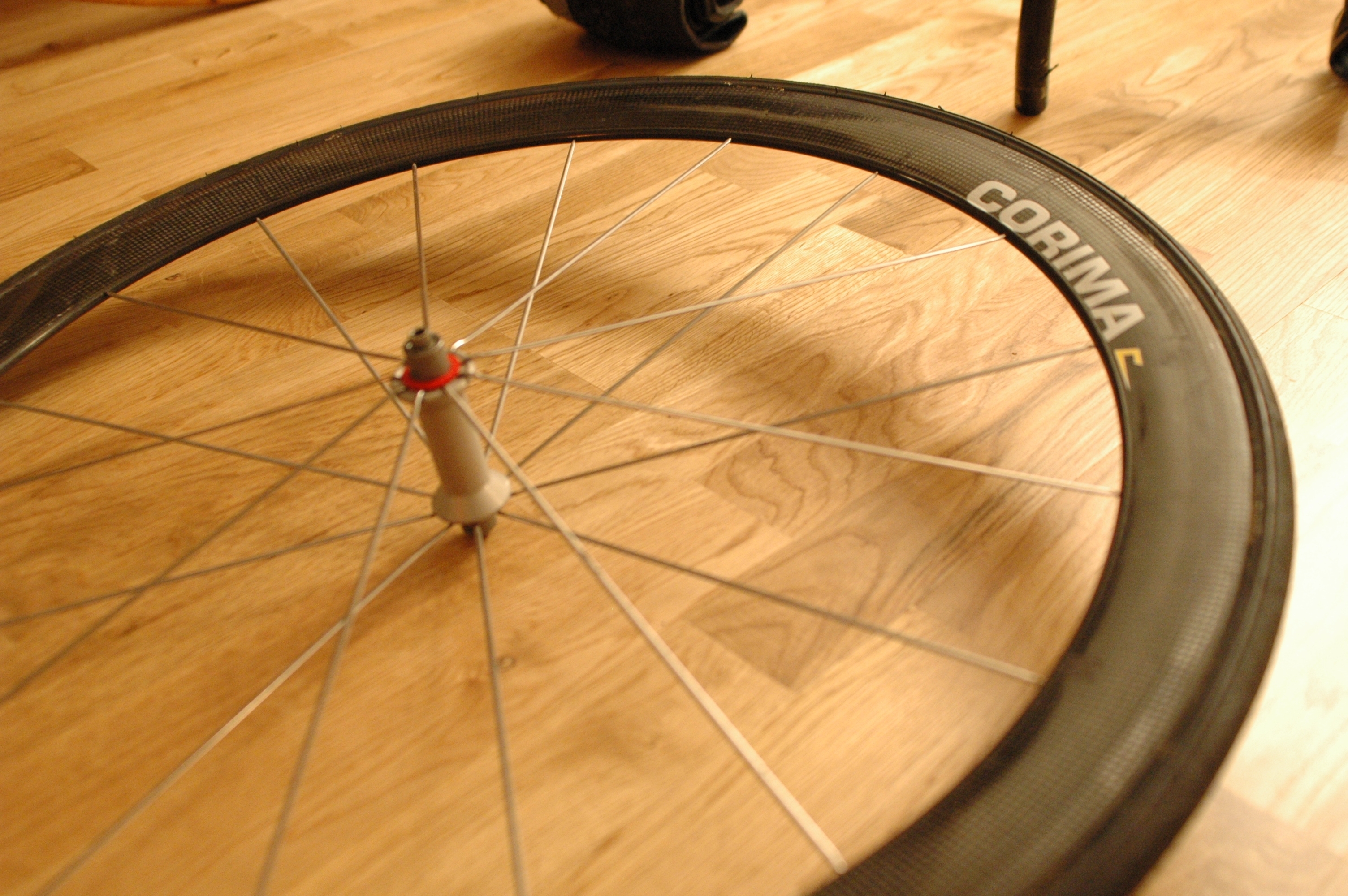som emnet sier.. karbon forhjul fra Corima. Pent brukt - jeg klarer ikke å se noe særlig slitasje i bremsebanen i allefall. Fulgte med en temposykkel jeg kjøpte - men jeg foretrekker clinchere, dette er for pariser.