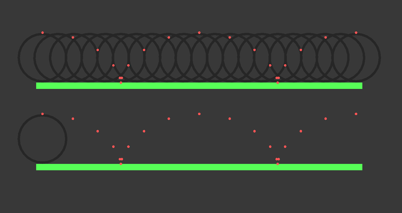 Et argument mot myten om at roterende vekt har mye mer å si enn annen vekt: Jeg lagde en illustrasjon til som viser hvor mye ett punkt på hjulet akselererer i løpet av to omdreininger mens det ruller mot en flate med konstant hastighet. Hver prikk viser punktet når hjulet er rotert 1/10 runde, altså 36 grader. Avstanden mellom prikkene viser hvor langt det beveger seg ved 1/10 hjulrotasjon. Kort avstand betyr at punktet beveger seg saktere mellom punktene.