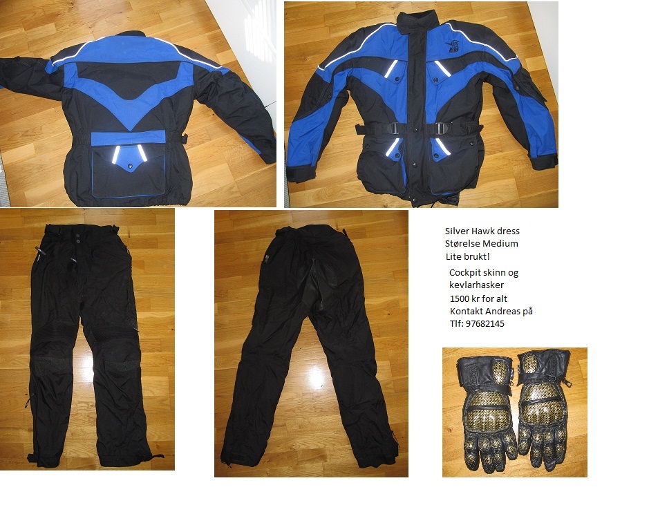 Jeg selger en meget lite brukt Silver Hawk MC dress str Medium. Rygg, skulder, albu, kne og hoftebeskytelser i dressen. Dressen er foret, men foret kan tas ut. Skinn og kevlar hansker fra cockpit.