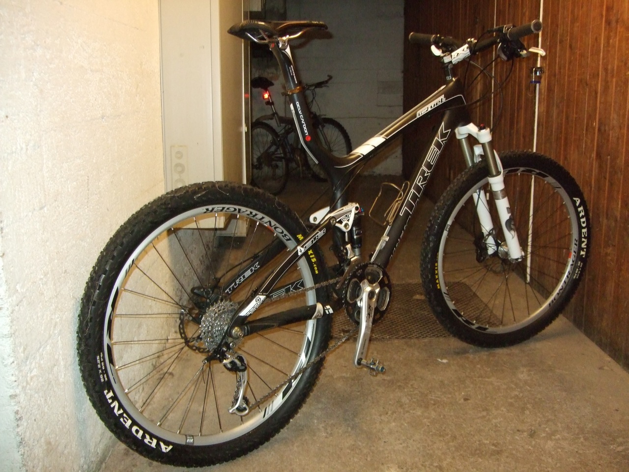 Frame: OCLV Red Carbon with ABP Race, Full Floater, magnesium EVO Link, oversized pivot bearings, replaceable derailleur hanger, and 100mm travel Rear Shock: Fox Float RP23 with Boost valve, rebound, new "Race Cam" ProPedal; 6.5"x1.5" Fork: Fox 32 F-Series Remote RL with air spring, rebound, remote lockout, alloy steerer, and 100mm travel Front Derailleur: Shimano XT Rear Derailleur: Shimano XT Shadow Shifters: Shimano XT Chainset: Shimano XT Chainrings: 44/32/22 tooth Chainrings Cassette: Shimano XT 11-32 tooth, 9 speed Front Brake: Shimano XT Ti Custom Rear Brake: Shimano XT Ti Custom Brake Levers: Shimano XT Ti Custom Handlebars: Race Face Next SL 3/4 Stem: Bontrager Race X Lite, 7 degree Rims: Bontrager Race Lite Disc Front Hub: Bontrager Race Lite Disc Rear Hub: Bontrager Race Lite Disc Front Tyre: Bontrager XR 1 Expert, 2.0 Rear Tyre: Bontrager XR 1 Expert, 2.0 Saddle: Bontrager Race Lite Seatpost: Bontrager Race XXX Lite, 34mm, 5mm offset Weight: 24.07lbs (10.92kg) Approx.