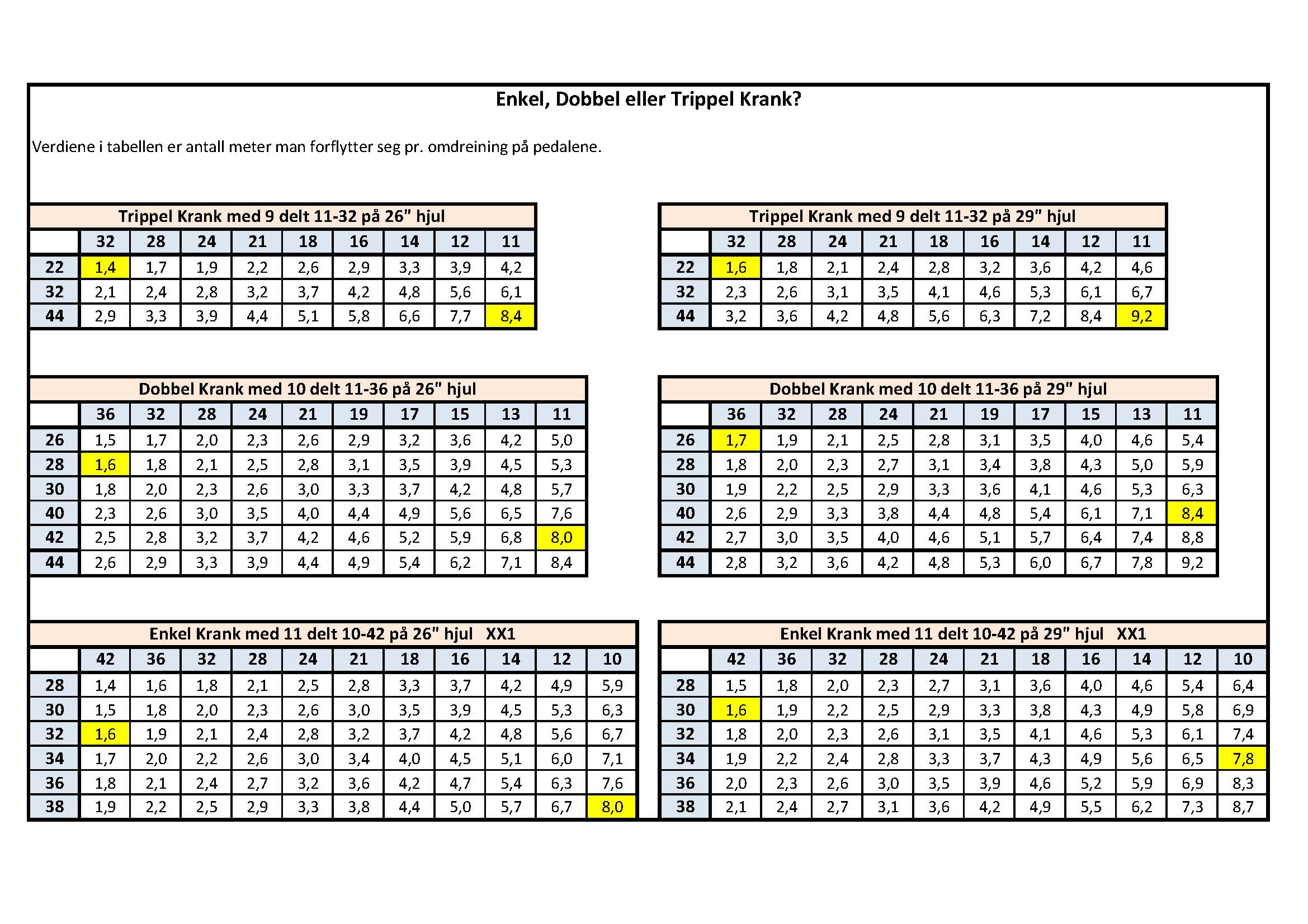 Neste år kan det godt være at det blir xx1, men hvilken drevkombo tilsvarer det jeg har kjørt med i år?? Du kan sammenlikne litt med ulike klinger og hjulstørrelser i denne tabellen :