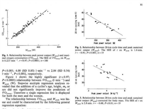 Jeg antar at du ikke har lest artikkelen, så her ser du tre viktigste figurene fra arbeidet. Som forventet ser de en klar sammenheng maksimal watt og absolutt maxO2 (Figur 1). Deretter ser de en klar sammenheng mellom maksmal watt og 20 km tempo (Figur 3). Denne sammenhengen blir litt mindre klar når vekten til rytterne legges til (relativ maxO2/max watt). Hvilke 19 av de 100 er det som har kjørt 20 kim? Ref Fig. 1.: Er det små forskjeller i watten på folk som har samme VO2max? Feks prikkene på ca 2.75 VO2max, har Wpeak fra ca 160-170 til ca 230(eller 260, hvis man tar med de prikkene med VO2max på 2.8-2.9), er det klar sammenheng? Og dem oppunder og opptil VO2max 4, og de på VO2max ca 5.5, som har watt-tall fra ca 400-540? Fig. 2.: Er det en stor tidsdifferanse mellom dem som kjører på ca 32 minutter og dem som kjørte på 38 min, ala wattdifferansen som er på 375-400(en på 450) og 250-300 for de langsomste? Hva er nullpunktet med hensyn til watt, dvs hva kan en gjennomsnitts person som ikke trener klare mht watt-tall? Fig. 3.: Samme som Fig. 2. dvs stor spredning i w/kg, og tider som er relativt nære hverandre?