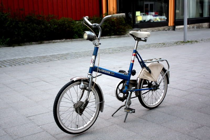 Det er en blå kombi med små hjul, og den kan deles i to. Har ett nytt dekk med hvite sider, og et sjeldent dekken på bakhjulet.