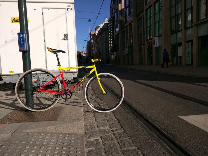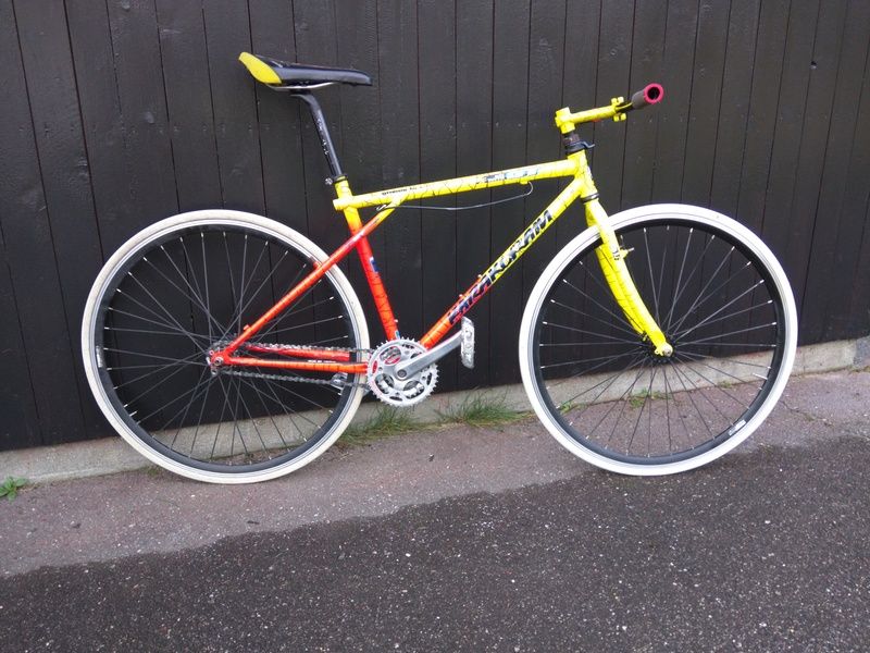 Den funker fin fint som fixie. Fått på en kjedestrammer siden det bildet ble tatt. Hjalp litt,men er spennende og sykle med i Oslo ICON_SMILE Er ingen ultimat ramme og bygge fixie på, men den ser og er dødsrå å sykle på ICON_SMILE