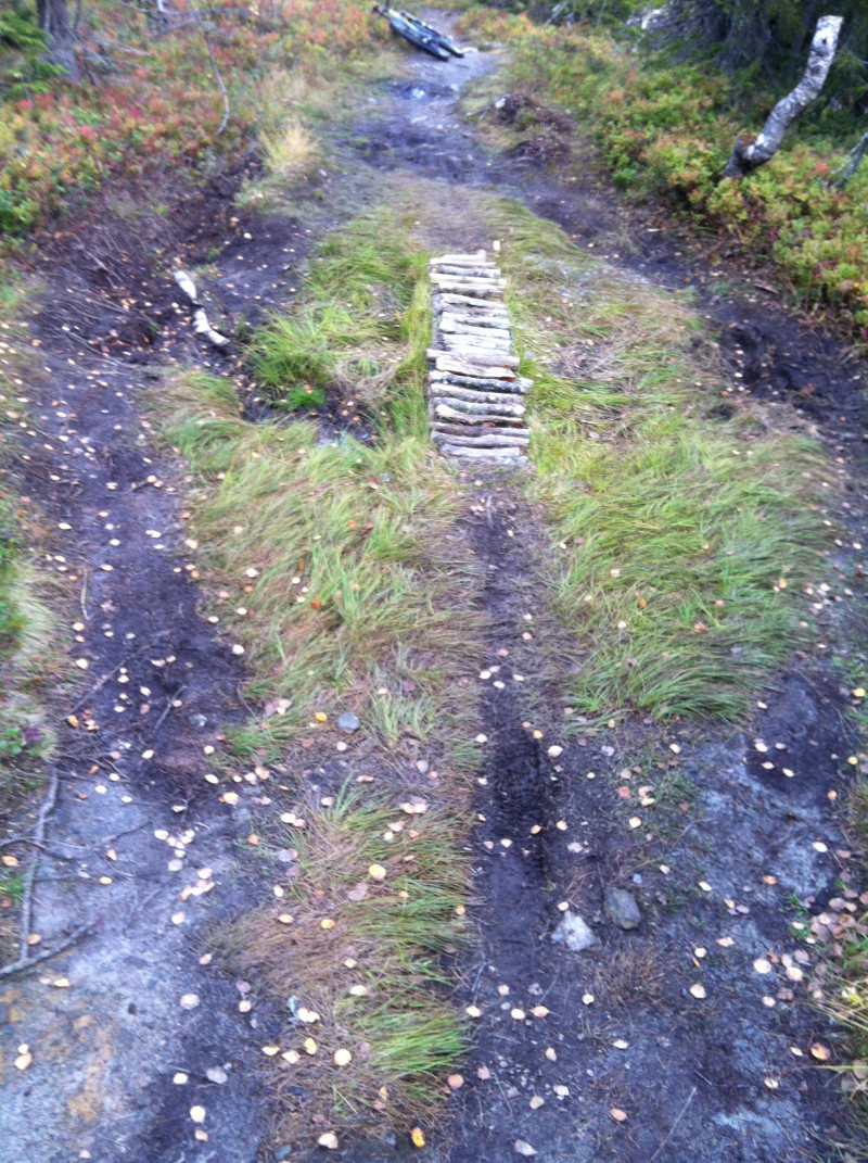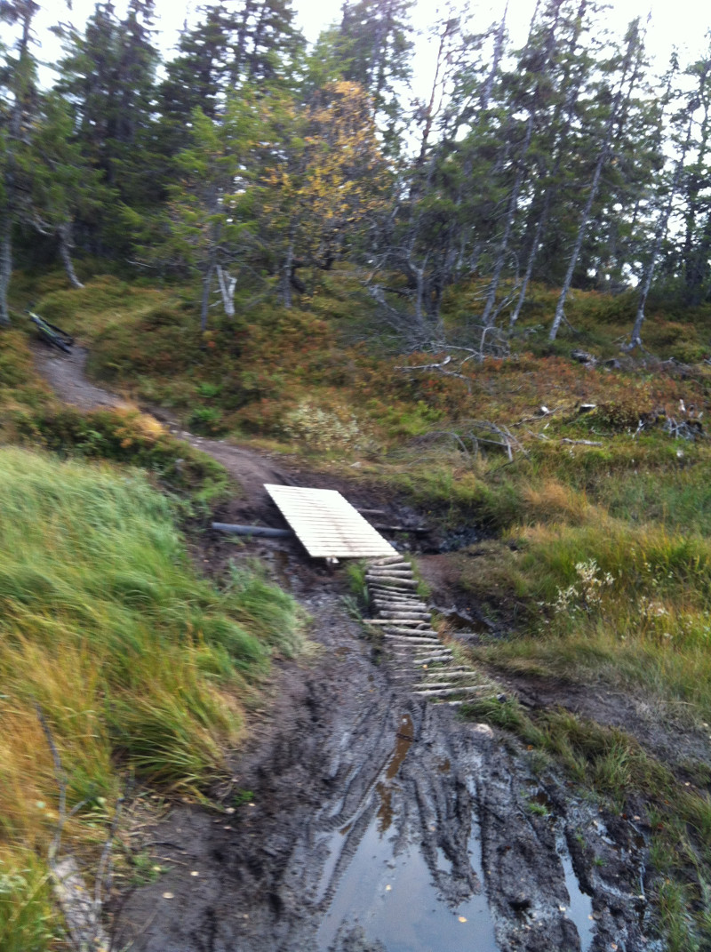 "Litt" for mye????? Klarer man ikke å klarere de gjørmehulla kan man finne seg en annen plass å sykle. Det er ikke meningen at alle skal klare å sykle alle stier. Det ene "crux", som ikke er et egentlig, men som kan oppfattes som vanskelig er det som man må enten kjøre en skarp "s" til venstre eller kjøre bratt rett ned til høyre og sneie et tre eller høkke over på midten og enten case i bekken som går på tvers eller hoppe over den i samma slengen.