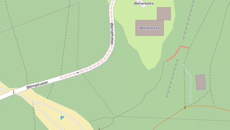 I finn.no kart kan du ved å zoome inn også få med tomtegrenser (stemmer ofte meget bra). Ut fra grensene rundt Østmarksetra ligger disse tett opp til bebyggelsen.