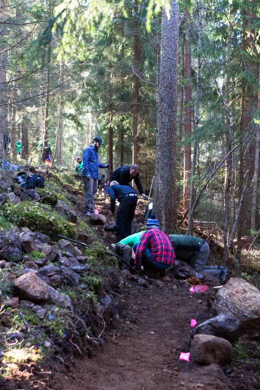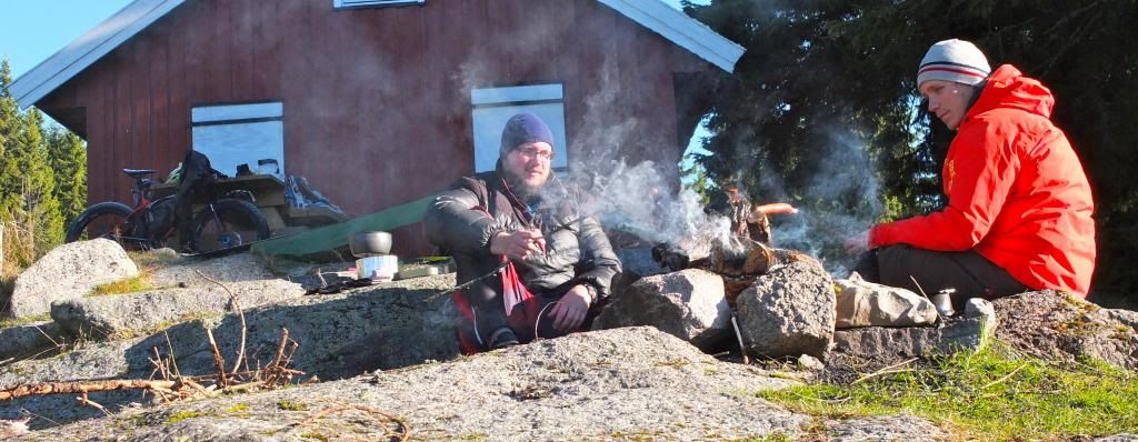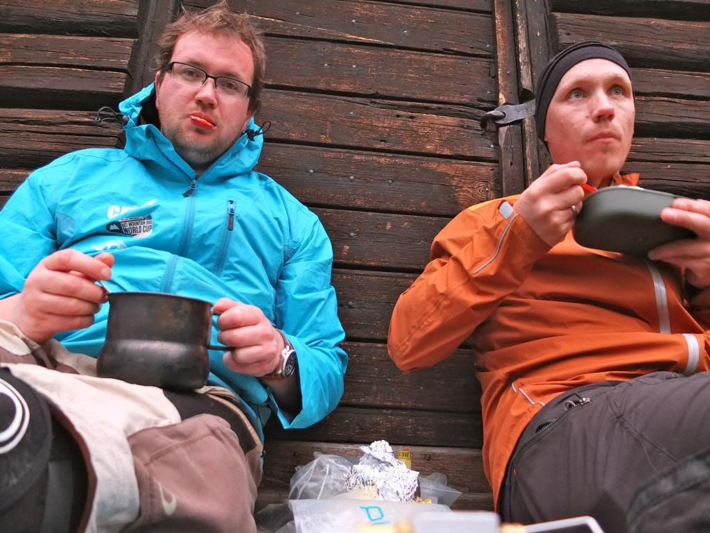 Etter omtrent 400 meter er jeg gjennomvåt, og på vei ned en bratt sti som jeg hadde tatt det rolig i godt vær, men fy så morro. Alle jubler, lite grep, mye drifting og høy fart. Stiene blir brattere, men moroa bevares, transportene opp til neste sti er kjedelige, men samtalen går og så lenge man ruller så er det ingen som klager. Etter fire timer bestemmer vi oss for å peke nesa oppover til Studenterhytta for å få litt varme i kroppen. Marius bestemmer for å sykle i forveien for å tenne på peisen og ha kaffen klar, men når vi kommer frem så har Martin disket med hjemmelaget løksuppe, varmt brød og kaffe. Varmekablene er klare for å tørke opp gjennomvåte klær og tdf står på.