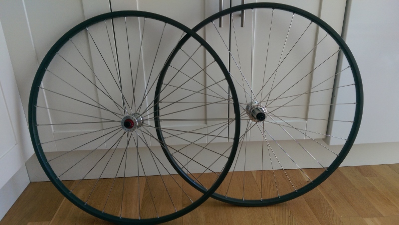 32-eikers lavprofilhjul, håndbygd med radielt framhjul med aero-eiker og to kryss bak.