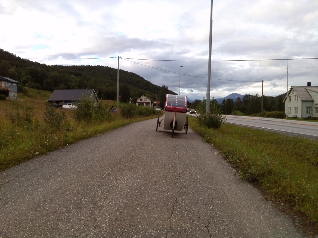 Det høres veldig tungt ut. Jeg har jo ikke akkurat valgt det mest slitesterke dekket. Det er høyre dekk som slites fort, og det er nok på grunn av at alle veiene jeg kjører på er skjeve så det er høyere belastning på høyre side. Det kan være ganske irriterende å kjøre trike på sånne veier. Hjulopphenget er symmetrisk.