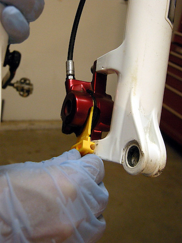 Transport uten hjul gjør slikt, kom ikke bremsene dine med en transportkloss? (Egentlig bare en kile du setter mellom klossene når hjulet er av.) Noe slikt, man kan og bruke 2 ispinner i hver kaliper og ha strikk rundt. Jo det er den transportklossen jeg kaller , bleedblock. På Avid bruker man baksiden når man lufter bremsene og den spisse enden mellom klossene ved transport, så det har jeg gjort.