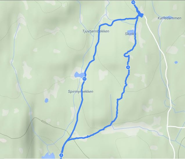 Jeg tror jeg har funnet stien Terka i dag. Syklet opp Aron (ble noe gåring/trilling), videre inn på vanlig måte til krysset ved Kamstrupen. Men i dag valgte jeg svakt høyre, opp den bratte bakken i enden av myra (Hauern går opp den bakken for de som går den om vinteren).