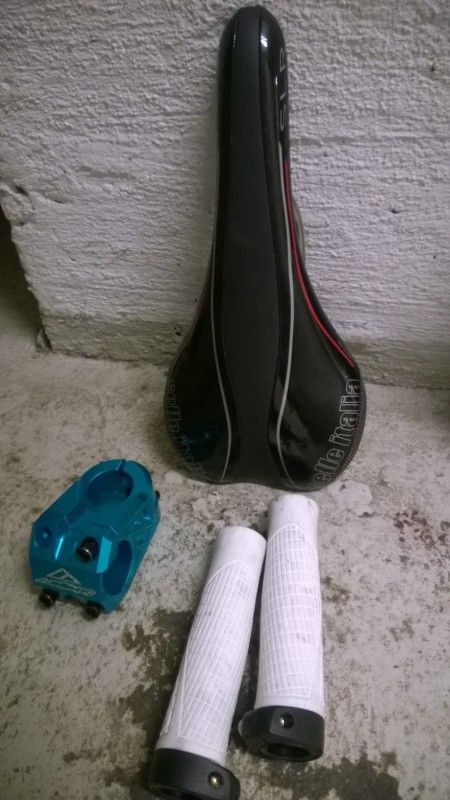 Ymse. Blir spennende å se stemet med resten av sykkelen. Holkene der er elendige, blir nok erstattet med noe ESI greier  Pedaler fra Crankbrothers  Bremseskiver, men viste seg at begge er på 200mm. Skal se om bakrammen har plass til dette, hvis ikke trenger jeg en 180mm. Bakgiret er det foreløpige gullkornet, med keramiske KCNC trinsehjul.