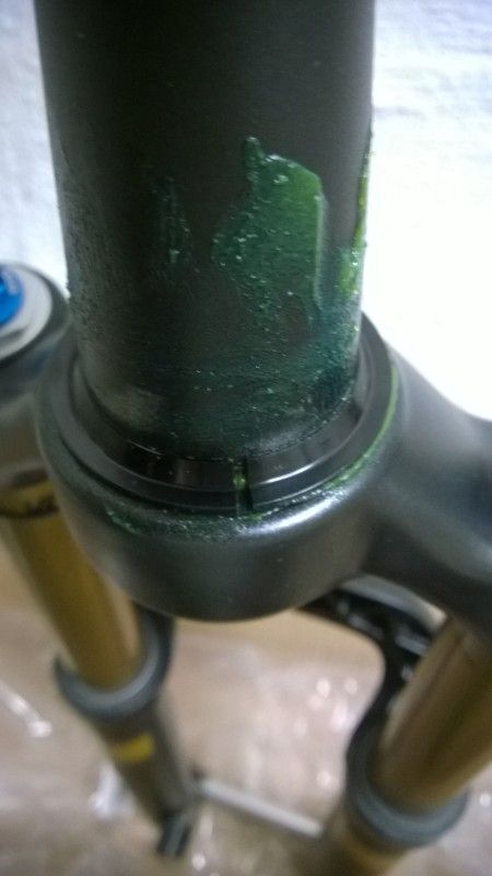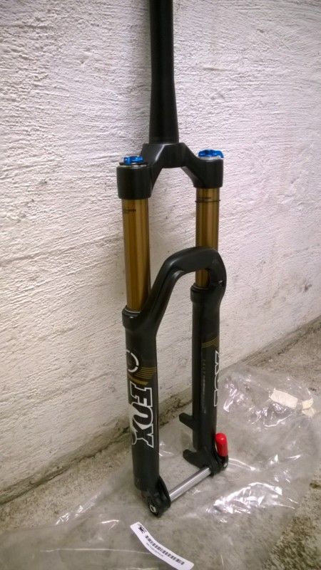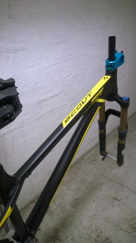 Veldig kort styrerør, 105mm. Men det er egentlig en bra ting!!  Ferdigsplittet crown race vitner om en produsent som har skjønt greia  Er et eller annet som er veldig stas med FOX og Kashima. Rammens utforming i overgangen seterør-overrør er litt uvanlig, og gjør at setehøyden ser helt absurd ut. Men geometrien på rammen tilsier mye lek og morro.  Stemet er faktisk ikke helt gæernt, synes nå jeg, selv om det er fargekrasj. Skal få montert sykkelen ferdig før jeg bestemmer om stemet blir byttet ut eller ikke  Nå merkes det at det er veldig lenge til (h)jul.  Fått beskjed fra England og min kamerat der at hjulsettet har fått en liten bulk på sesongens siste tur....svarte f***!!! Så da står det mellom Mavic crossmax XL og DT Swiss EX 1501 Spline. Begge hjulsett kan anskaffes rimelig og til omtrent samme pris Hvilket skal man velge? Noen med erfaringer...? Neste uke kommer det kranklager (shimano Saint) kranksett (shimano XT) og kjedefører (sram X0)
