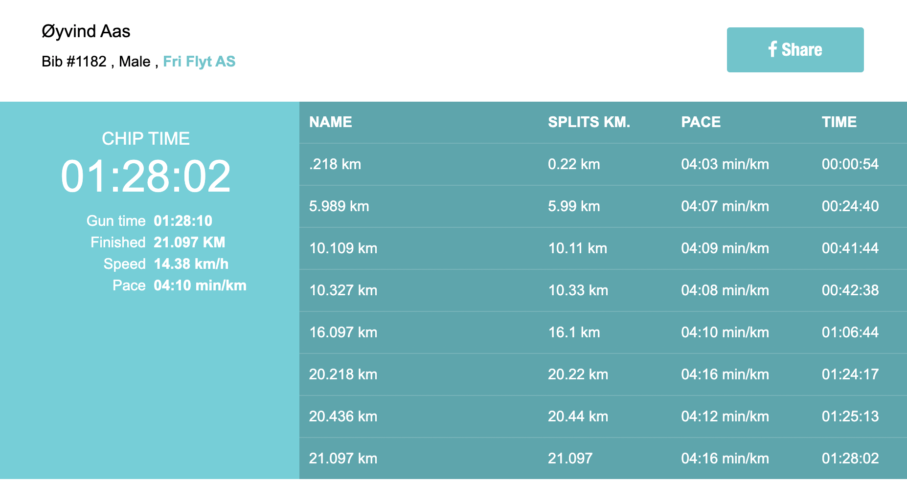 Kom inn på 1.28.02 i mattetid, noe som kanskje kan føles litt frustrerende, men samtidig ikke. Jeg kaller det 1.28. Pers med over 4 minutter må jeg vel være fornøyd med, selv om minst to av minuttene nok skyldes skoene.