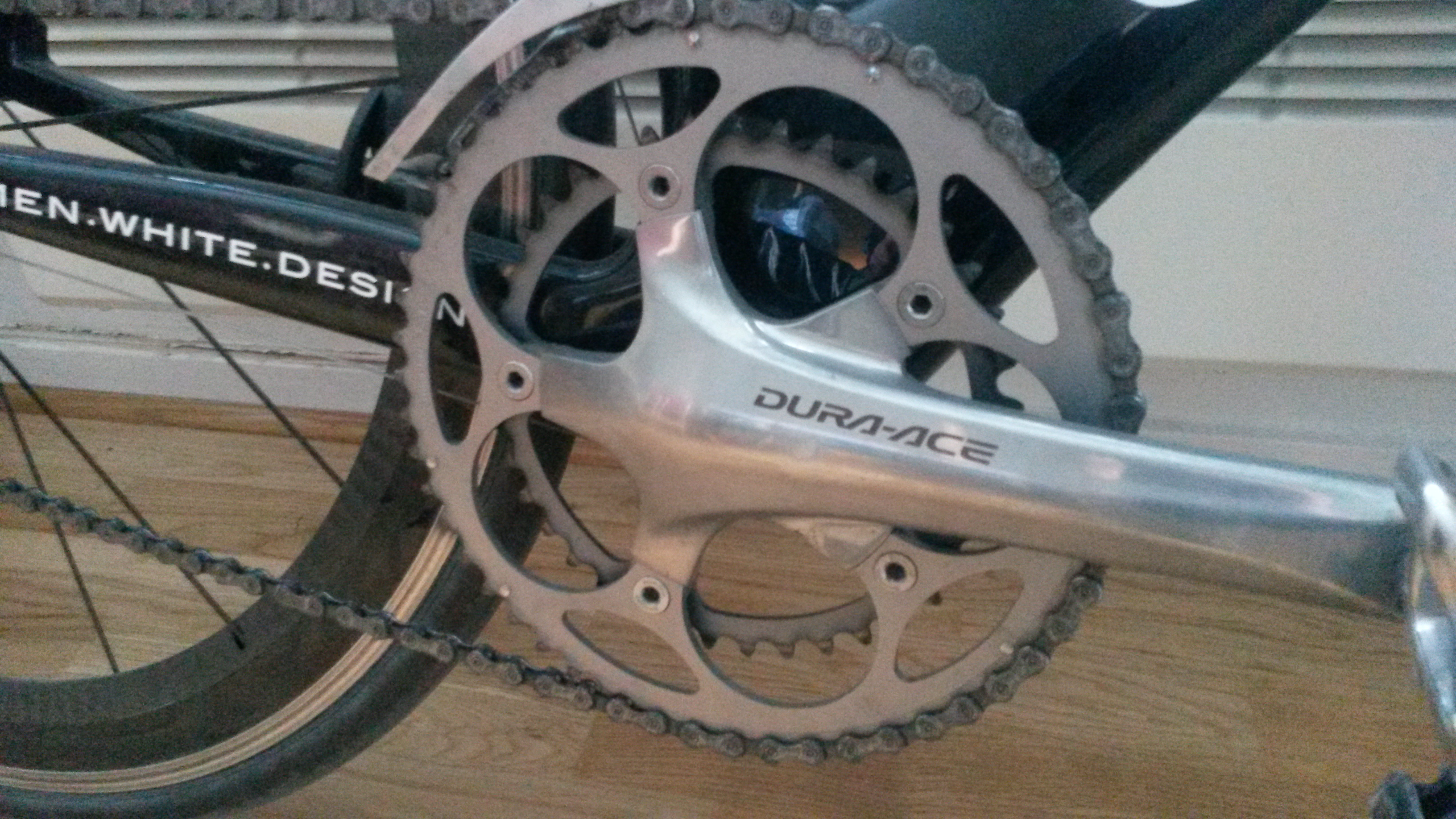 Pga overgang til kompaktkrank (50/34 110BCD) selger jeg et stk Dura Ace kranksett med 53/39-drev (130BCD).