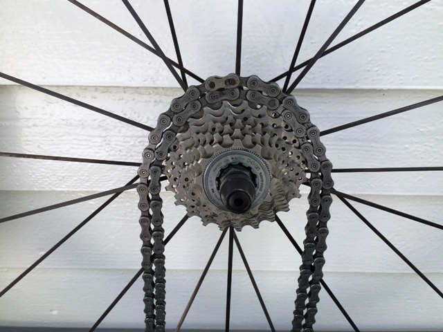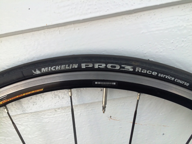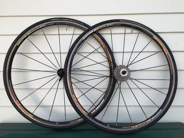 Mavic Ksyrium Equipe, med Michelin Pro 3 Race (23 mm) og Shimano 5600 kassett (12-25) med tilhørende kjede.