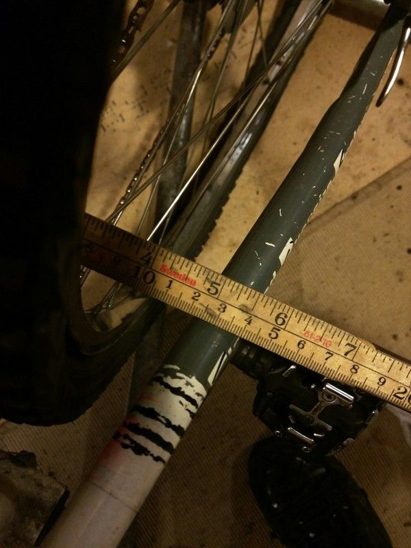 Først bredden på kjedestaget /ytterste punkt av bredden 1) der det går gjennom seterøret, og 2) litt bakenfor, omtrent der det krysser felgen.