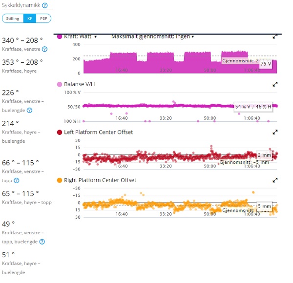Når det gjelder feks pedal-senter-forsyvning så har den de 2 siste øktene vært på -6mm(venstre) og 6mm (høyre) i snitt. Regner med at optimalt er 0mm på begge og at dette kan optimaliseres med å justere cleats.