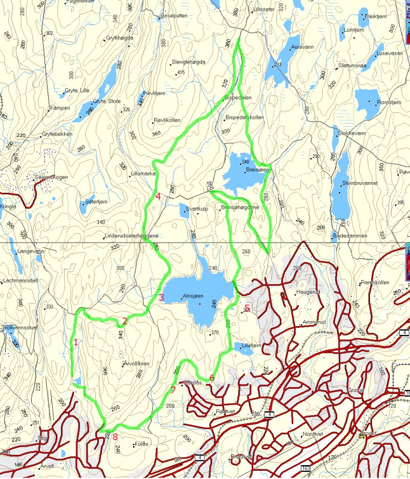 Takk for tur! Her følger frihåndstegning på kart. 1. Bli varm på 30 sekunder -bakken, og starten på Godløypa. 2. "Bære" nedover 3. Der vi ventet på Håkon og Helle 4. MMB og Kenza skriker i skogen. Tilbake på Godløypa. 5. Håkon og Helles residens 6. Der StigB vraka giret. 7. Grusen StigB ble dytta på 8. Bommen på Tonsenhagen, og der enkelte uten bil sykla hjem