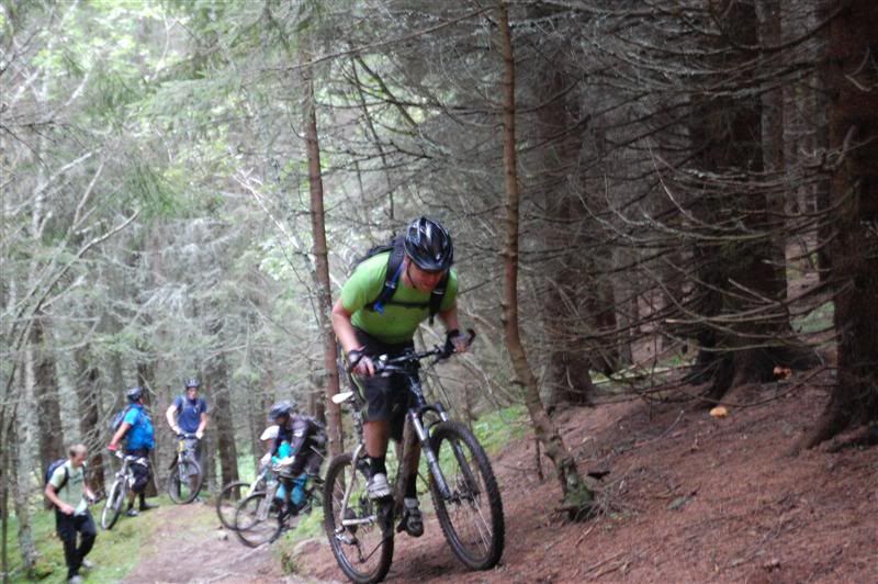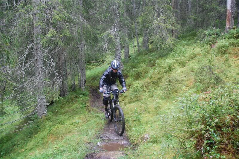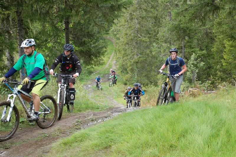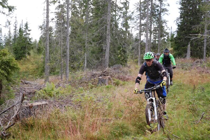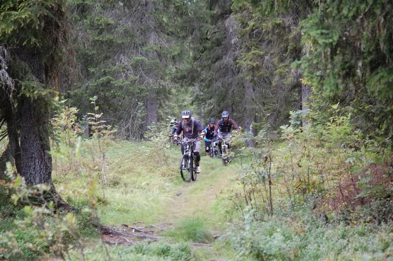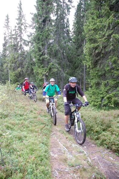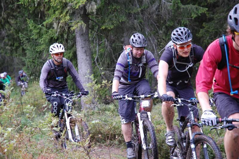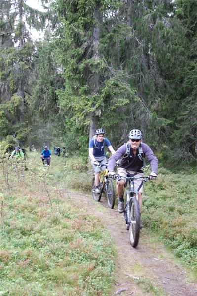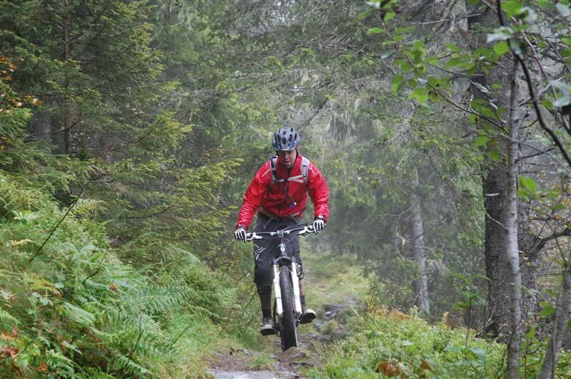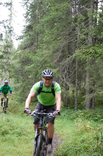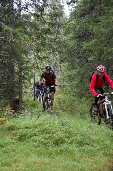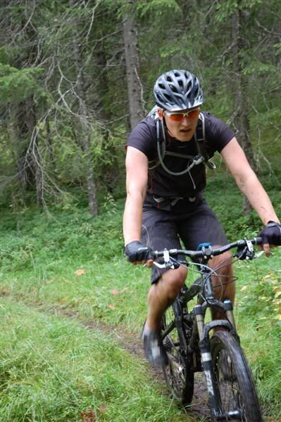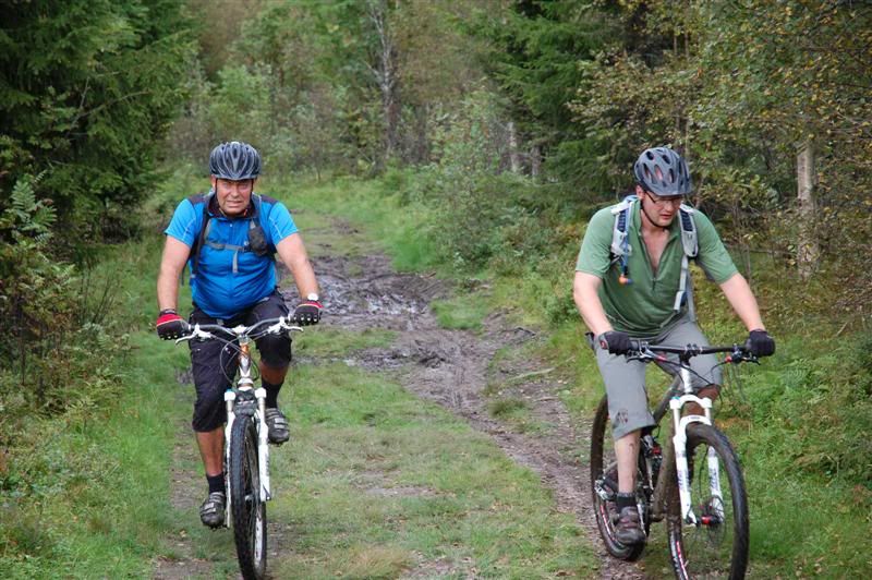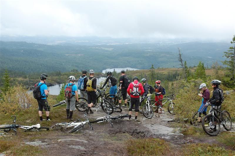Her er noen bilder fra fredagens TerrengTreff tur i Estenstadmarka: En liten pause for å få igjen pusten Gjørmehullet i bakgrunnen var ganske så dypt! Nesten oppe på Liaåsen Lars og Kjartan på fin-fin flytsti ned fra Liaåsen Mye folk ute i skogen Køsykling! Masse blide folk Arild koser seg Johanna med følge Blid syklist på våt og fin sti