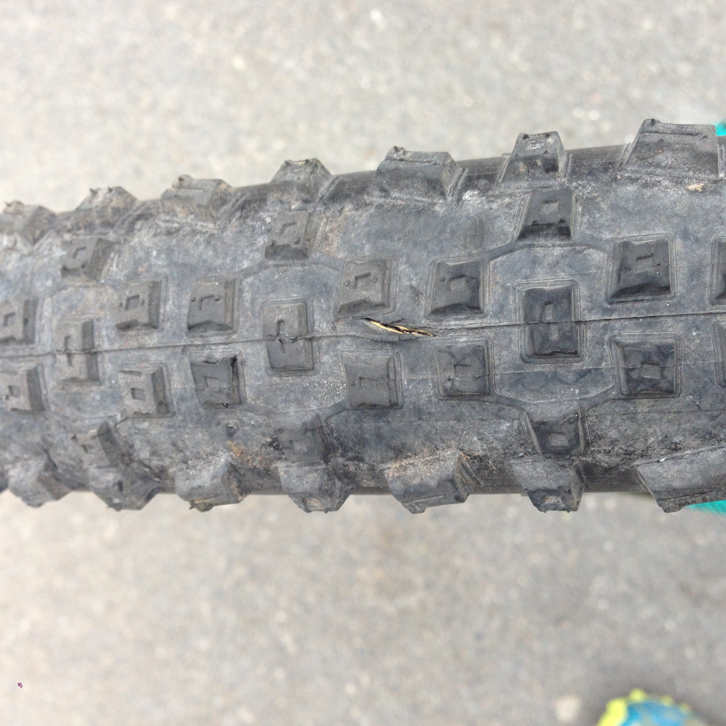Det är ganska litet typ 1cm långt. Det ser ut som en längsgående spricka i framdäcket, det verkar vara hål rakt igenom men jag har inte velat peta så djupt i det.