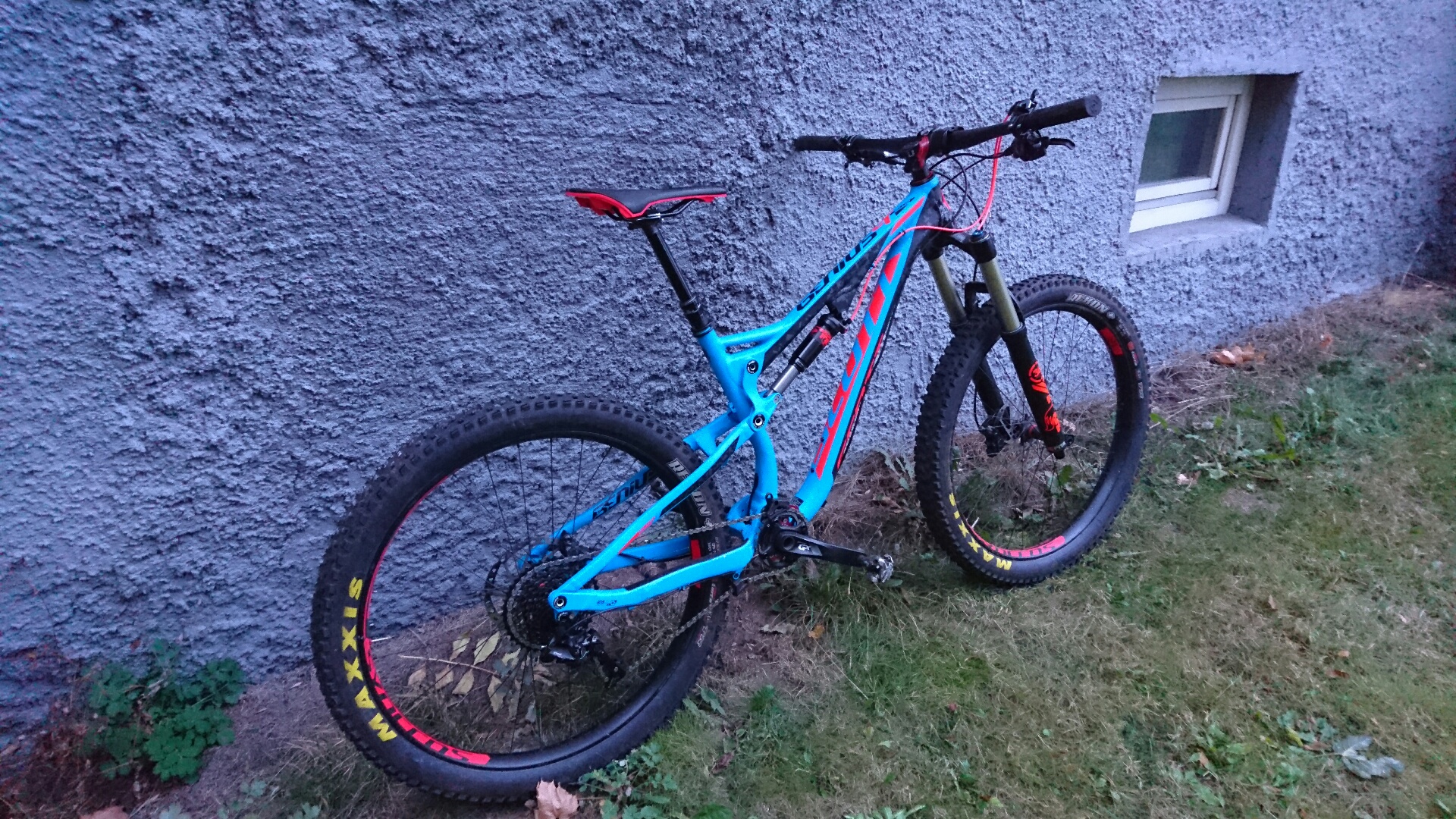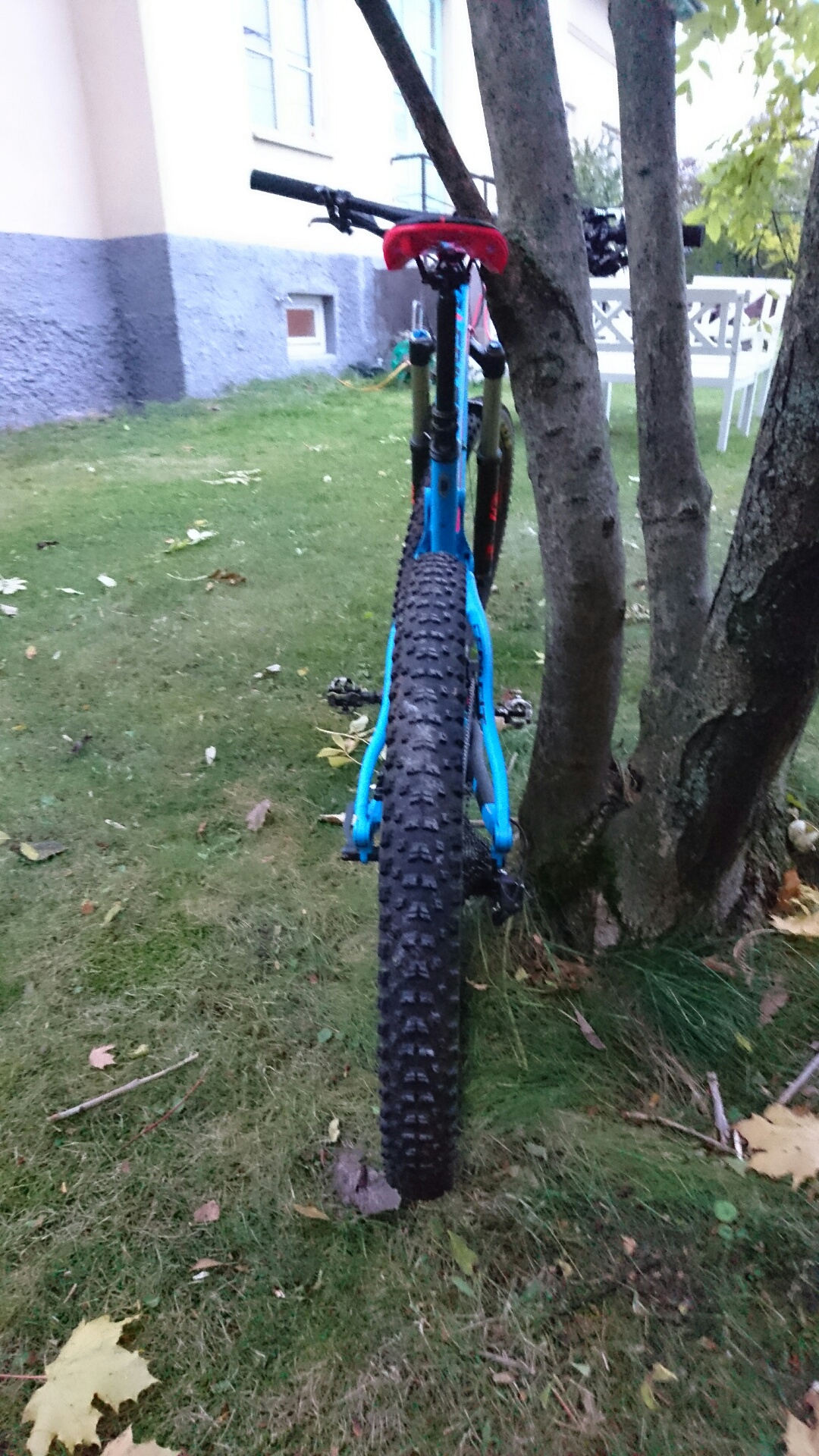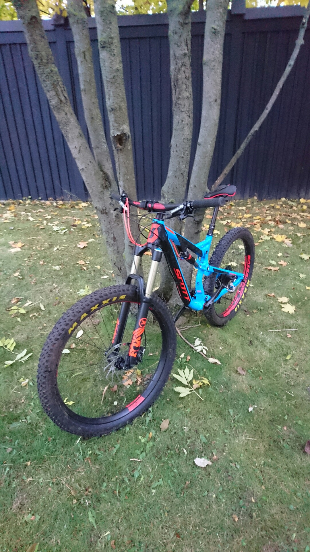 Sykkelen står nå på Maxxis Rekon+ (27,5x2,8) ett noe tøffere dekk enn originaldekkene Schwalbe Nobby Nic (27,5x2,8) som medfølger.