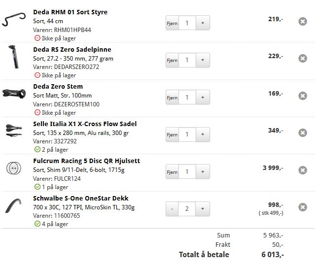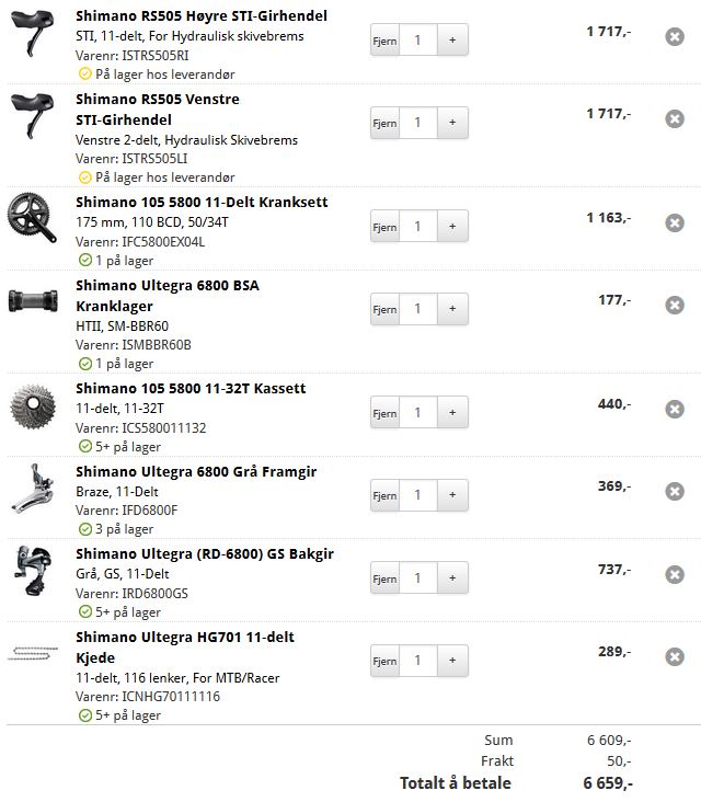 Tok en kjapp runde hos Bikeshop og plukket noen fiktive handlelister. Valgte 105 krank og kassett med Ultegra front og bakgir. Og fylte på med ellers greie og velprøvde deler. Ved å bruke dette som utgangspunkt, kan du søke og se om det er noe å spare andre steder.