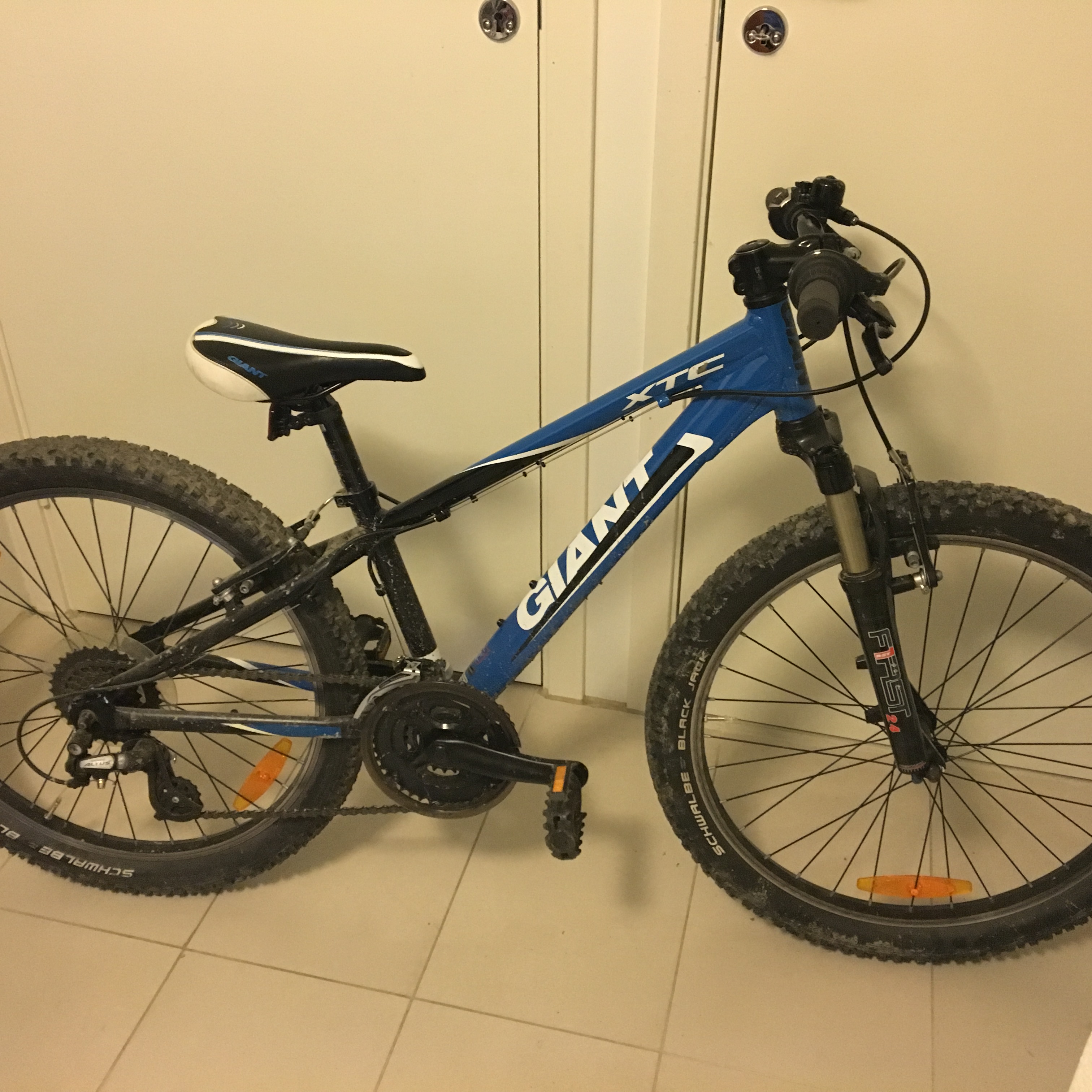 Giant XTC 24" terrengsykkel. Leken sykkel med fin geometri for barn som vil ut i terrenget. Oppgradert med en skikkelig dempegaffel, RST First Air. Låsbar luftdemper som kan stilles inn etter behov (f.eks stivhet, retur). Dette er en demper som fungerer. Det er også kjøpt nye dekk, Schwalbe Black Jack. Breie dekk med stort volum og godt grep. 21 gir. Ingen tegn til slitasje av drivverk og bremser. Pent brukt. Selges med originale dekk og slanger i tillegg til original dempegaffel. Pris diskuteres