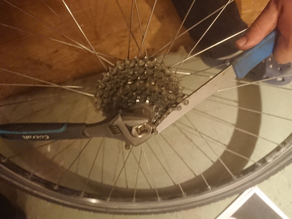 Det er lettest med kjedepisk på stort tannhjul og en kassettavdrager med arm som gjør det mer stabilt (+ hansker). Også setter man hjulet mot bakken og presser til det man orker med all vekt (Da løsner det meste.).