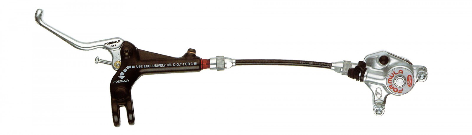 Disse kalipperne som jeg kjøpte har ikke hydraulisk hendel, men (både 22mm chainstay mount som klein brukte noen år etter, og) et fiffig mellomstykke som inneholder reservoar og overfører kreftene fra bremsewire til væsketrykk, slik at en kan bruke mekaniske bremsehendler, og dermed også landevegsbremsehendler..