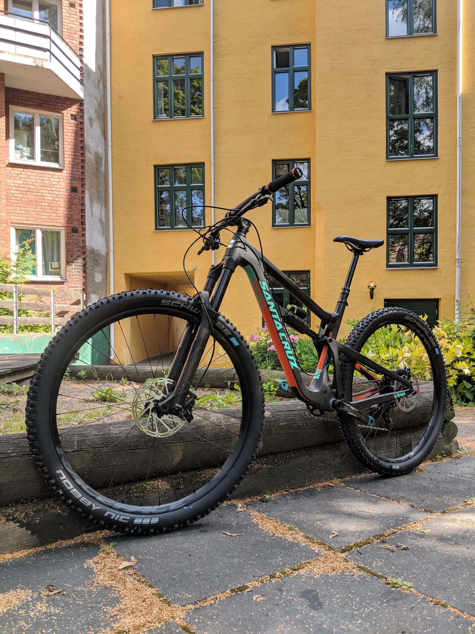 Sykkelen er satt opp med 150mm gaffel og 29" hjul. Både dekk og hjul er spell nye og har ikke rullet en meter (hjul kommer fra ny sykkel). Gaffelen er oppgradert med Vorsprung Luftkappe, og bakdemperen er byttet ut med en DVO Topaz - gode oppgraderinger som løfter en allerede veldig bra sykkel. Bakgir og bremserotor bak er også nye. Setepinne kommer rett fra service hos Spinn.
