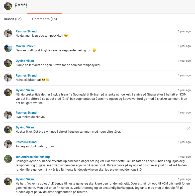 Etter at man har brukt Strava noen år så forstår man at det er naturen til KOMer å bli slått etter en stund. Det bekrefter at verden går videre, på en måte. Står KOMen din lenge er det gøy, men det er enda bedre å bli utfordret ved at noen tar den. Hva er vitsen med et segment hvis det ikke er noen som sykler fort der?