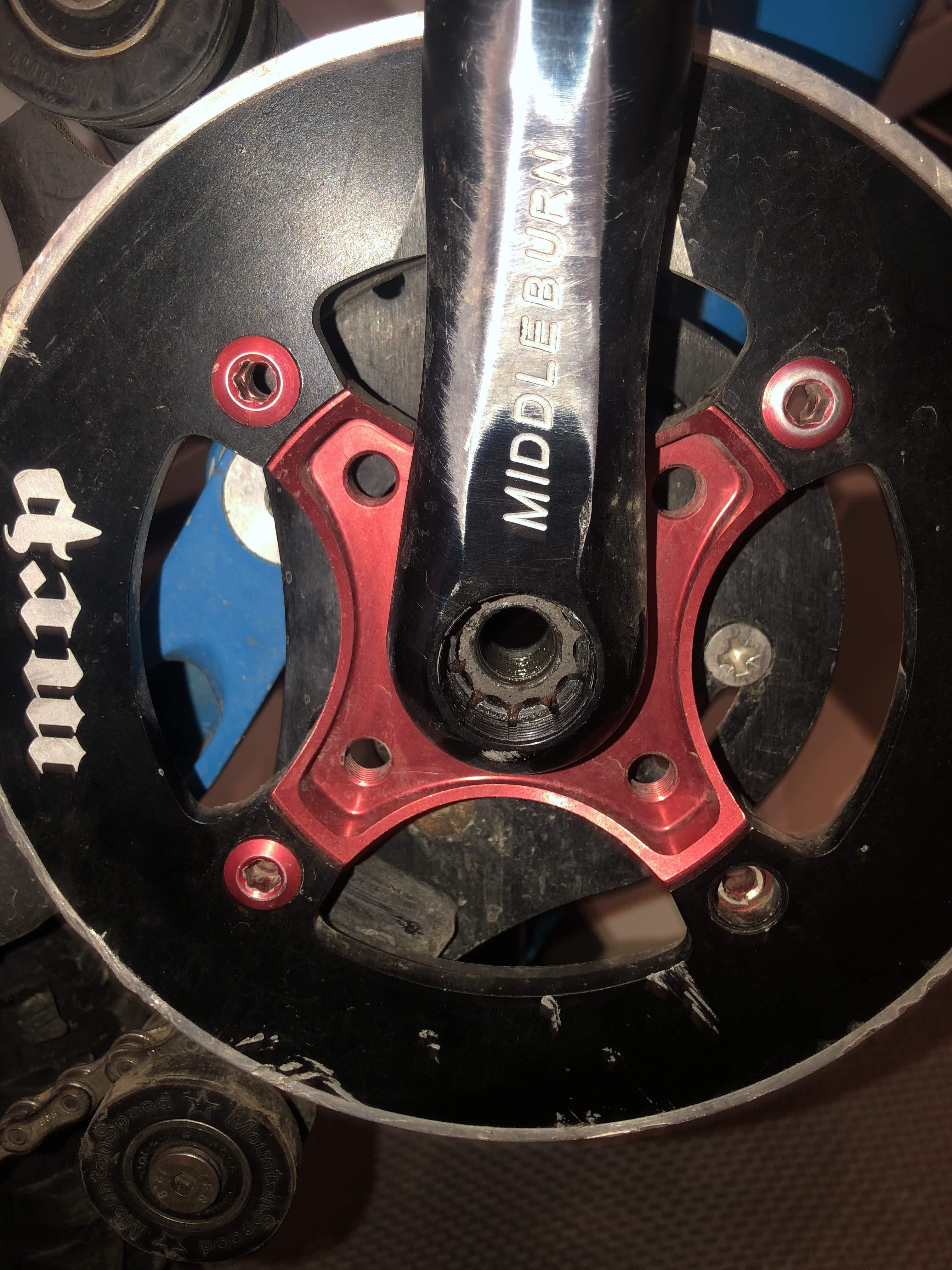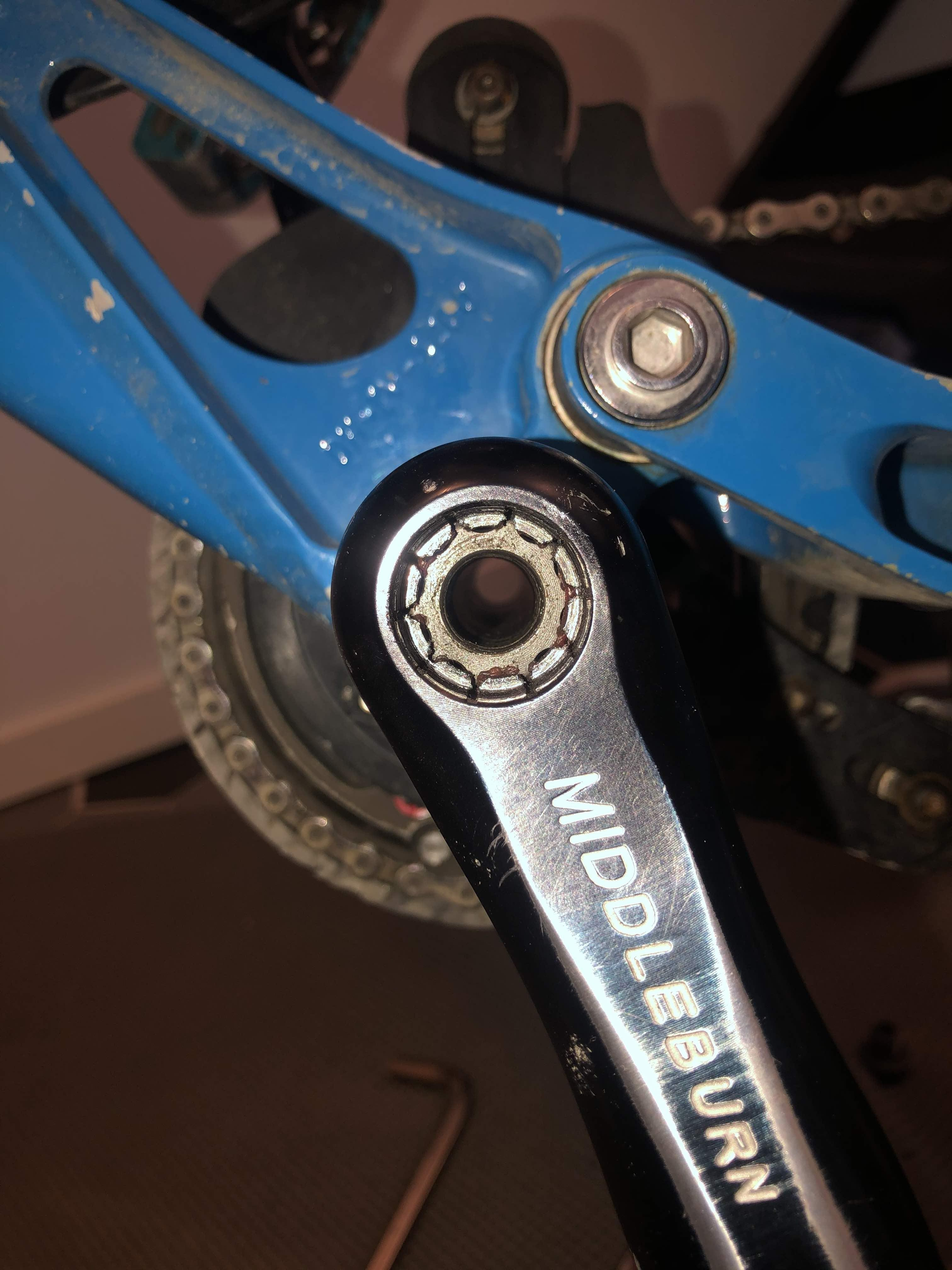 Jeg har hatt Middleburn-krank på en sykkel for noen år siden. Mener å huske at de brukte firkant eller ISIS på sine kranker. I bildet over ser det ut som du har et ISIS-lager. Du trenger et slikt verktøy: https://bikeshop.no/park-tool/ptbbt22/park-tool-bbt-22-kranklagerverkt%C3%B8y-for-isis-shimano