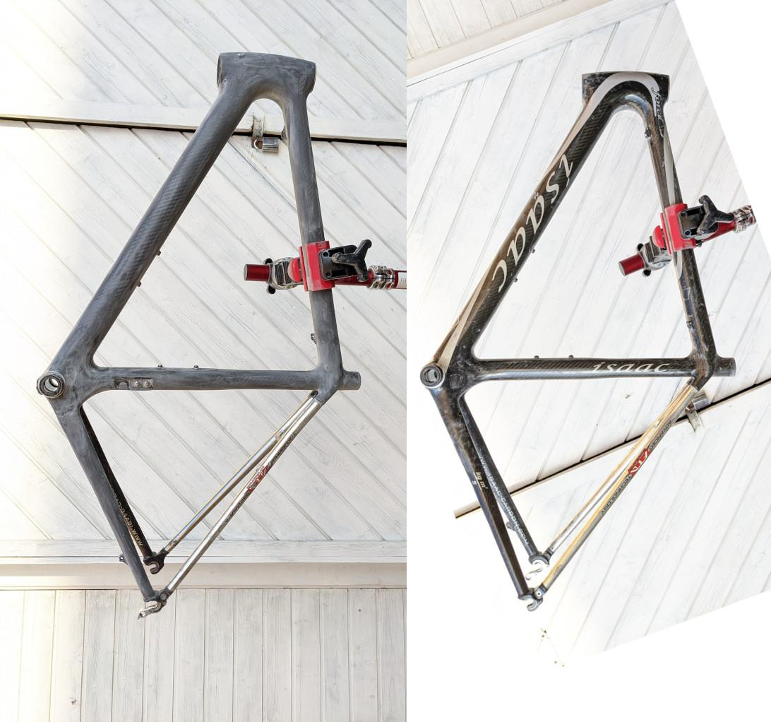 Utngangspunktet: Rammesettet heter Isaac Force, og er trolig produsert engang mellom 2003-2008 (gjetter jeg). jeg har ikke brukt særlig tid på å finne ut av det enda, men så vidt jeg har skjønt var Isaac ganske tidlig ute med å eksperimentere med karbonrammer. Har sett referanser til utviklingen av Force rammesettet med alu-setestag til veldig tidlig 2000-tall. Men når det kom for salg, og hvorvidt dette var første modellen som ble solgt, eller om dette er en nyere variant enn den første, det vet jeg ikke enda. Om noen sitter på mer detaljer gi meg gjerne beskjed, ellers skal jeg forsøke å grave litt mer i det ved en senere anledning.