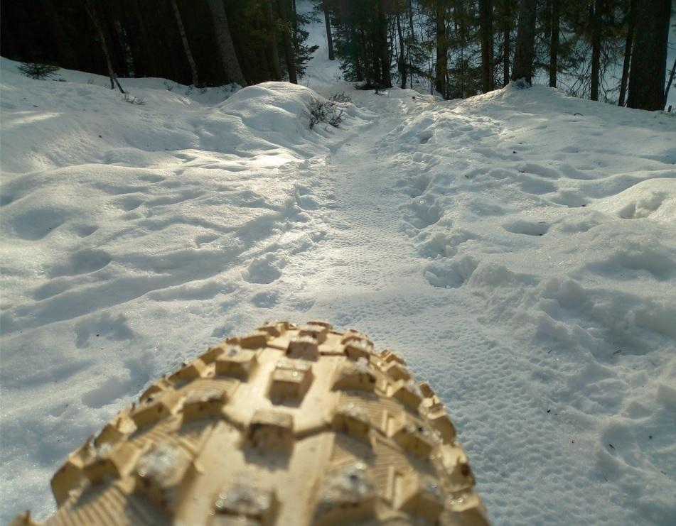 Var ute i går formiddag i bærumsmarka, og på tross av at jeg måtte dytte mye i de bratteste oppoverbakkene, og i brattish nedover blei det fort litt seiling var det gøy, og snøen som var kommet var så pudrete at bortover/nedover kunne du sykle utenfor stien uten problem.