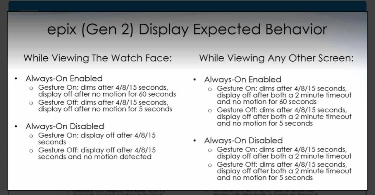 Veldig fornøyd med Epix 2 så langt. Jeg ser at man kan sette "Power Save Timeout" til "Extended" for en gitt aktivitet. Prøvde dette og lot den ligge stille på bordet. Da timet den ut etter 1 minutt. Men når man sykler er det jo noe bevegelse. Når jeg beveget litt på klokken timet den ikke ut. Men den dimmer ned til lavere nivå noen få sekunder etter man har rørt den sist (kan settes til maks 15 sekunder).