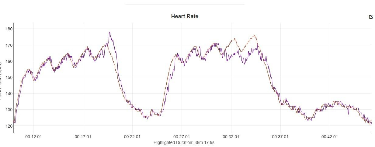Uansett vises det godt i grafen under som er et uttrekk fra arbeidsperioden i en sone fem økt. Lilla farge er Wahoo og brun er Andersson. Vi ser at Wahoo skyter over mål på siste periode i bolk en og langt under på siste periode i bolk to. Så Andersson gir de troverdige resultatene her. Resten av økta var så lik at det ikke er interessant i det hele tatt.