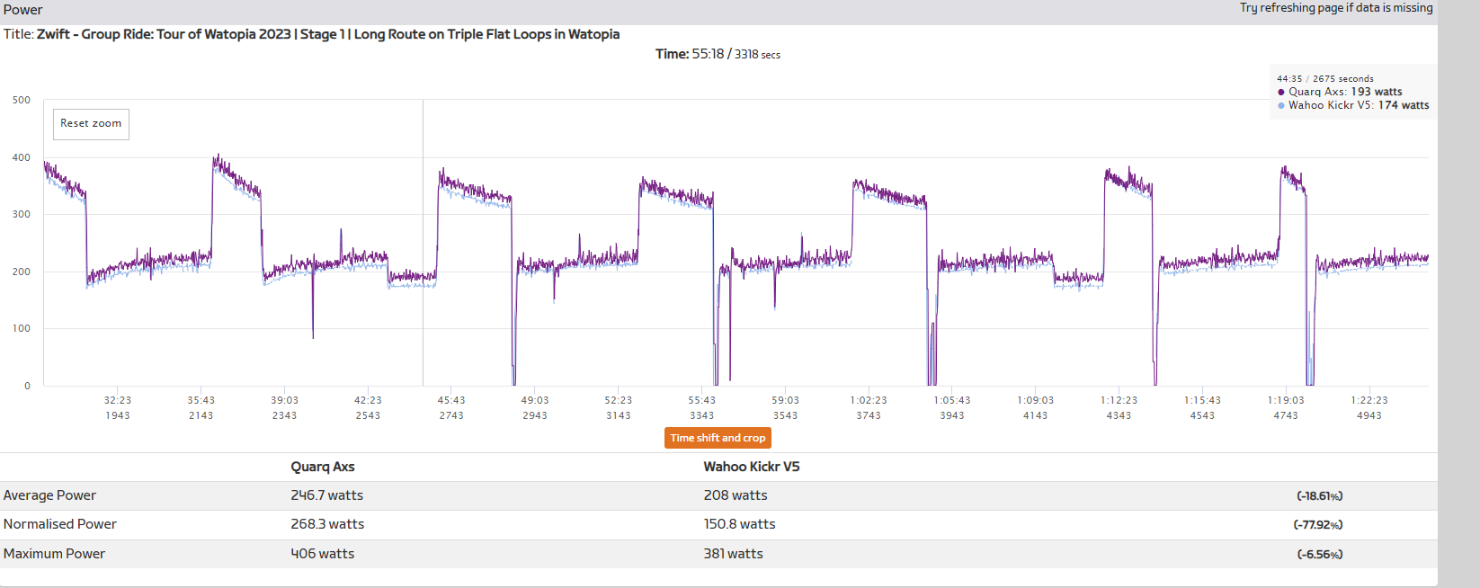 ...på andre dual recordinger jeg har funnet med quarq på zwiftpower så er forskjellen dog typisk at quarq ligger et par prosent over. Syns 5 var mye.