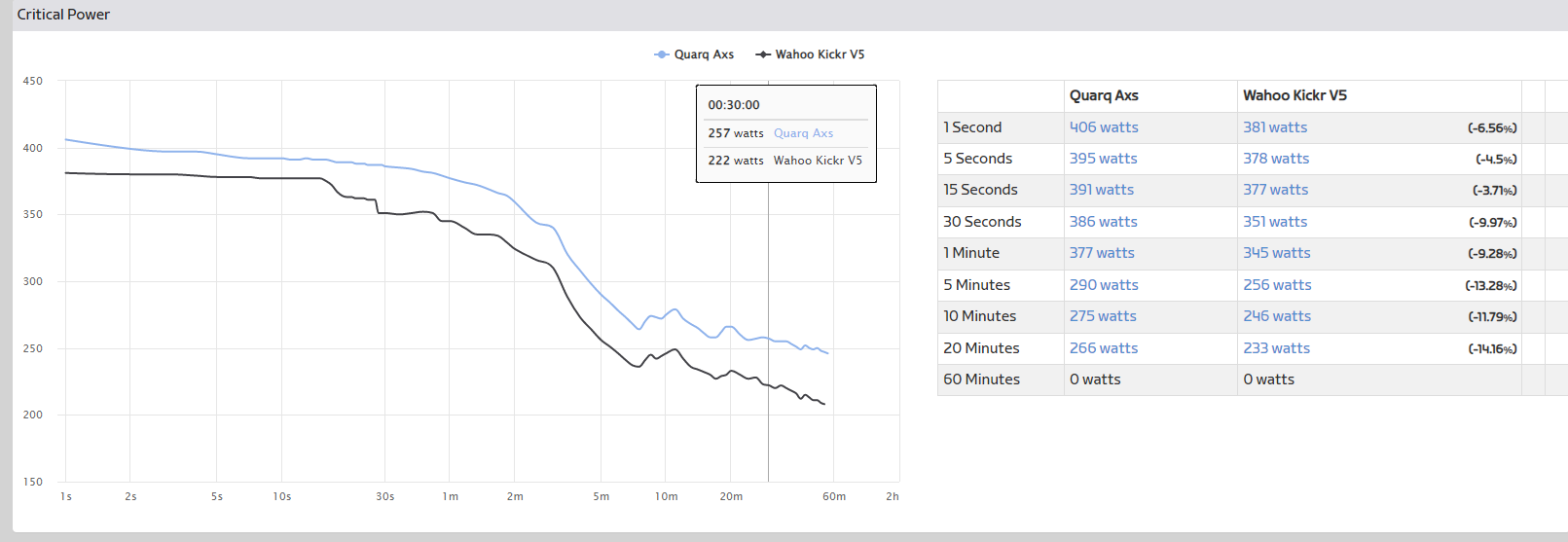 Jeg har nylig fått en sykkel med Quarq Axs wattmåler med dobbeltsidig måling, så tenkte å ta en test på den. Kjørte ei økt i erg med 2 og 3-minutts intervaller. Lot Kickr V5 styre motstand. Bare ett datapunkt enda, men ser at Quarq måler en del høyere enn V5.
