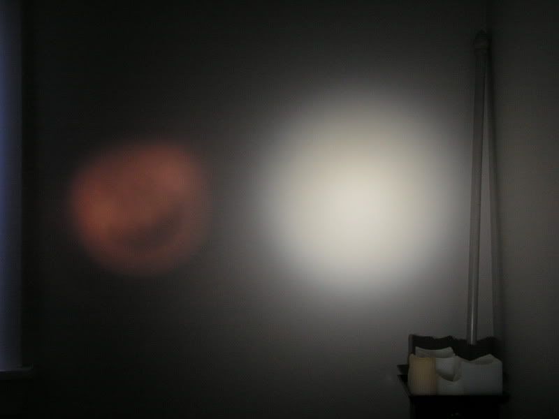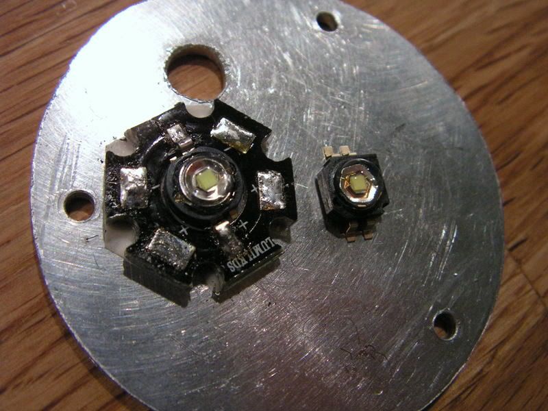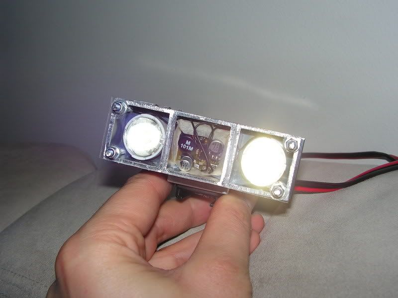 da er den ferdig! ganske ghetto-style i utseende, men jeg tror funksjonen er veldig bra, spesielt kjølingen. jeg var litt bekymret for at cool-tape padene ikke skulle lede nok varme fra diodene til kjøleribben, men den blir ganske fort varm, så det tror jeg er ok. har ikke testet enda, men kommer med en rapport så snart det er gjort. bak: bak igjen: front:  med lys:  sammenlignet med en mini maglite AAA med helt nye batterier:  jeg har gått litt rundt i bakgården og testkjørt litt, og det ser igrunn lovende ut. dette blir nok en hjelmlys siden jeg har 2 x 6 grader linser. bygger nok en til til styrebruk med litt mer spredning.