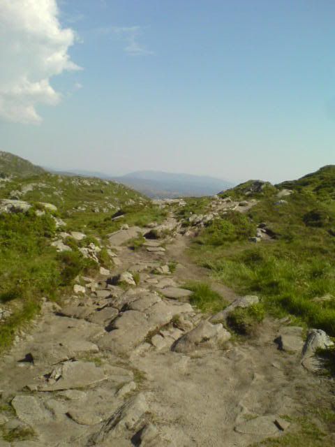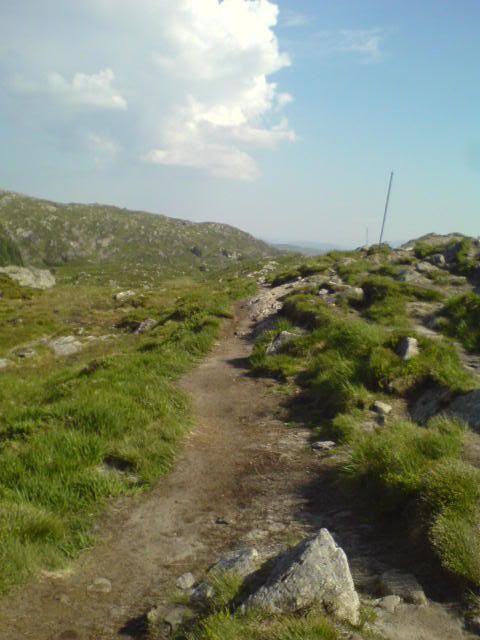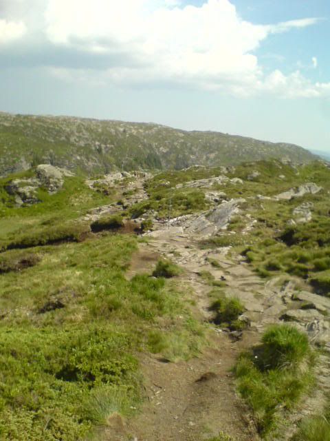 Ned til høyre over noen klopper over en myr (mot guldsteinen). Følg stien. Blir kanskje litt oppstykket til tider, er slak oppoverbakke.