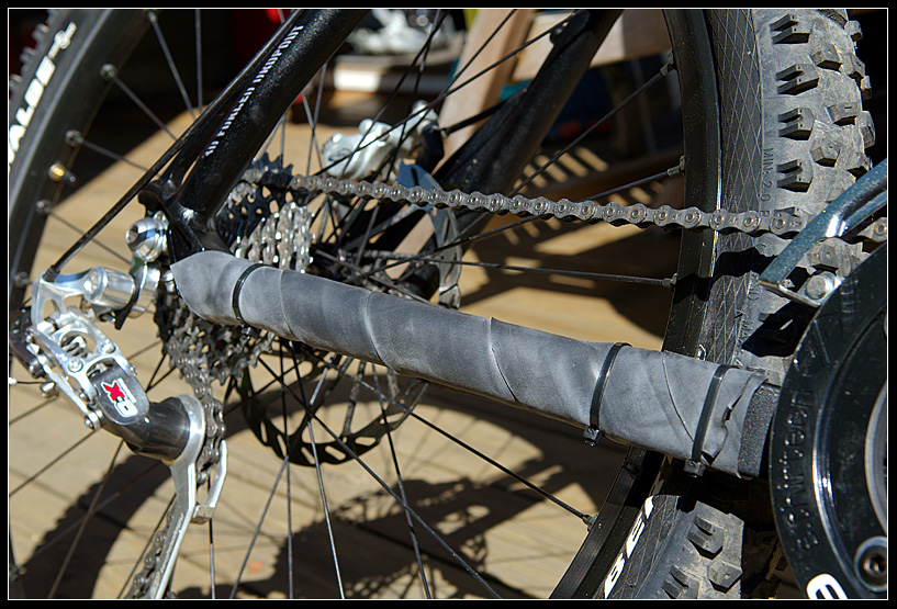 Jeg har en annen variant som er svart men likner. Mye tøffere enn disse neoprengreiene som vrir seg og ikke tar av for skikkelige smell engang, (og de blir jo slitt!).. En meter av denne rekker til mange sykler og du har til begge sider.. ;-)
