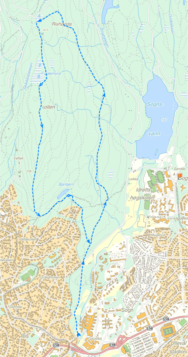 Start ved Rikshospitalet dra opp Gaustadskogen. Når du kommer ut på den åpne "flaten" fortsetter du rett frem inn i skogen. Her går en brei og god sti som etter en knapp kilometer eller så treffer Ankerveien. Fortsett rett frem her ca. 50-100 m til et kryss og ta opp til venstre. Dette er "Seniorstien", og denne følger du helt til den smelter sammen med "Måneskinnsstien" som er en traktorvei som kommer opp fra Sognsvann. Følg videre oppover til du kommer til nok et kryss, her går Seniorstien til høyre og Måneskinnstien rett frem. Du følger Måneskinnstien, og etter et par solide kneiker og mot slutten et ganske steinete teknisk parti, kommer du til en myr som bør forseres på venstre side. Rett etter denne er krysset som leder mot Vettakollen, som du følger til venstre. Etter en stund kommer du til en større myr som ligger på høyre hånd, og her gafler stien seg. Du følger til høyre/rett frem og nå er det strake veien rett frem til utsiktspunktet Vettakollen. Kjør ned den ubermorsomme kammen og ta grusveien til venstre ned mot Båntjern. Du passerer tjernet og kjører ned en liten pakke, her er det et kryss. Ta til høyre her og følg stien i skogen. Her er det et par alternativer underveis, men du vil uansett til slutt havne nede på flaten ovenfor Gautadskogen.