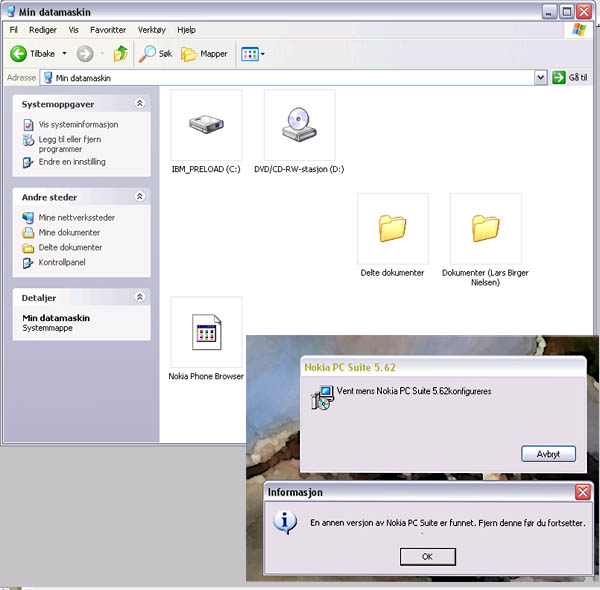 Det verste er at jeg får stadig opp infobokser som forteller meg at ”Vent mens Nokia PC suite konfigureres” Så kommer denne: